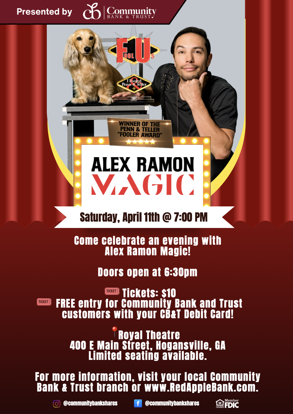 The show begins at 7:00 PM on Saturday, April 11th, with doors opening at 6:30 PM. Tickets are just $10, and Community Bank & Trust customers receive free entry when presenting their CB&T debit card!