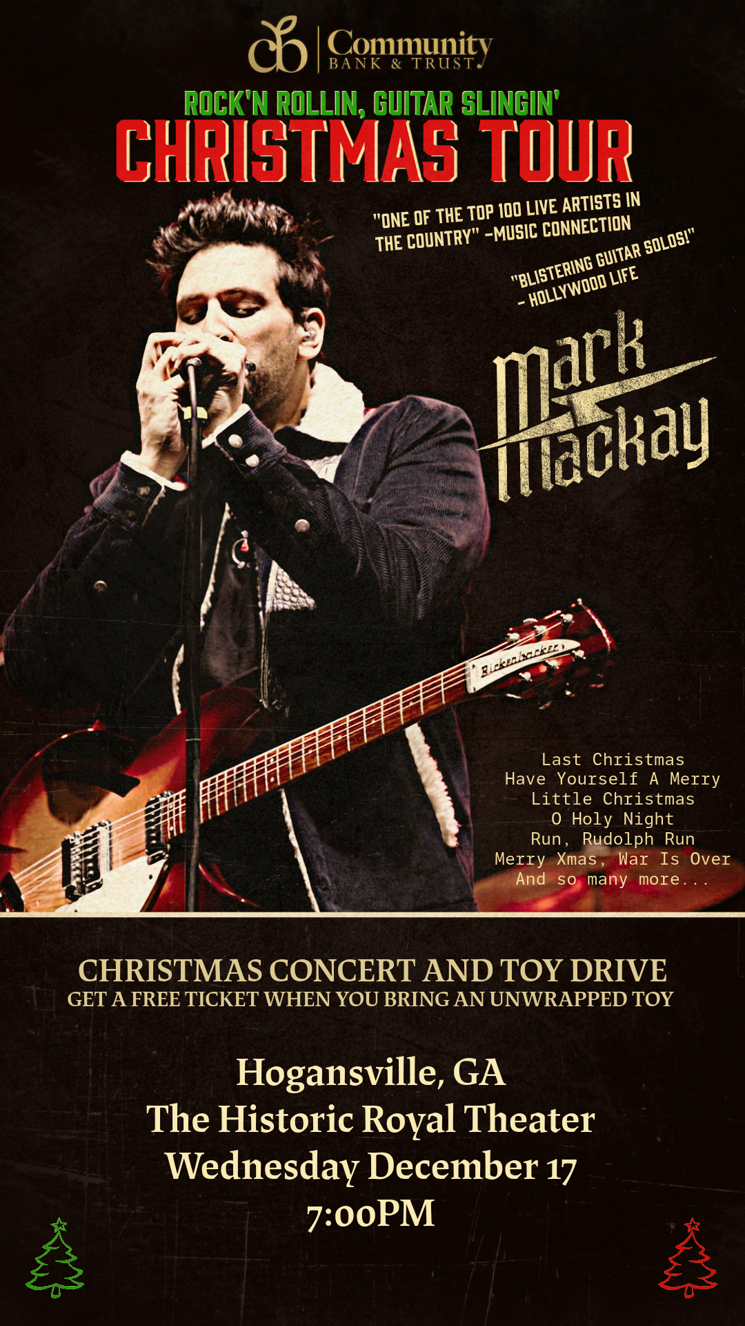 Get ready for an unforgettable night of holiday spirit and live music! Join Mark Mackay and guests —one of the top 100 live artists in the country, for a rock’n roll, guitar-slingin’ Christmas show featuring hits like Last Christmas, O Holy Night, and Run, Rudolph Run.